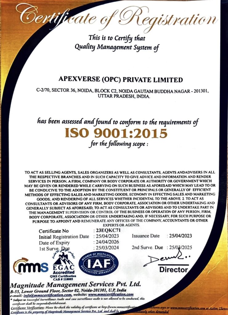 Our quality management systems are aligned with ISO 9001:2015 standards to ensure consistent service excellence and process efficiency. This certification demonstrates our commitment to maintaining standardized processes, continuous improvement, and effective quality. By following internationally recognized quality benchmarks, we aim to enhance customer satisfaction, reduce operational risks, and deliver high-performance.